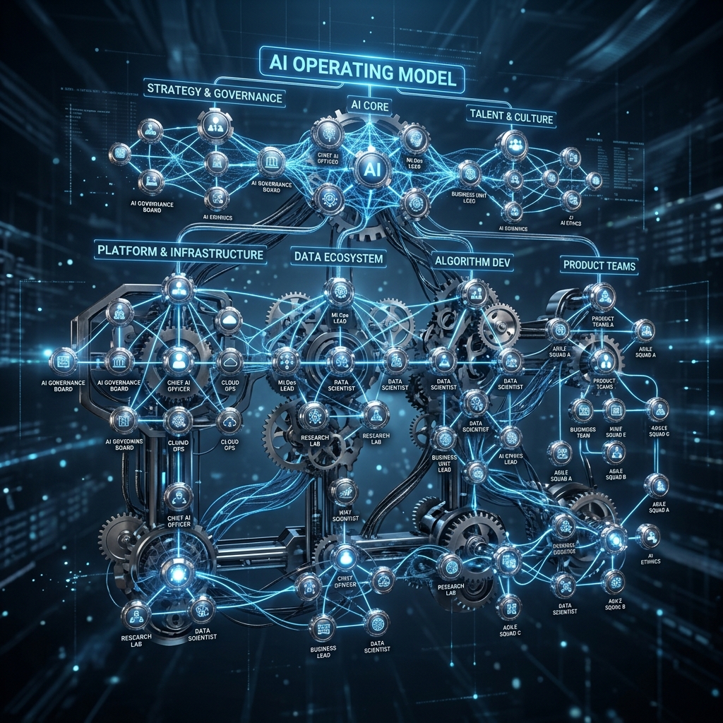 To extract actual economic value from artificial intelligence, organizations must violently redesign their internal architecture. Building an AI Operating Model means dismantling the rigid silos and replacing them with an agile, heavily governed, cross-functional structure. The companies that reorganize first will completely dominate the companies that just buy software.