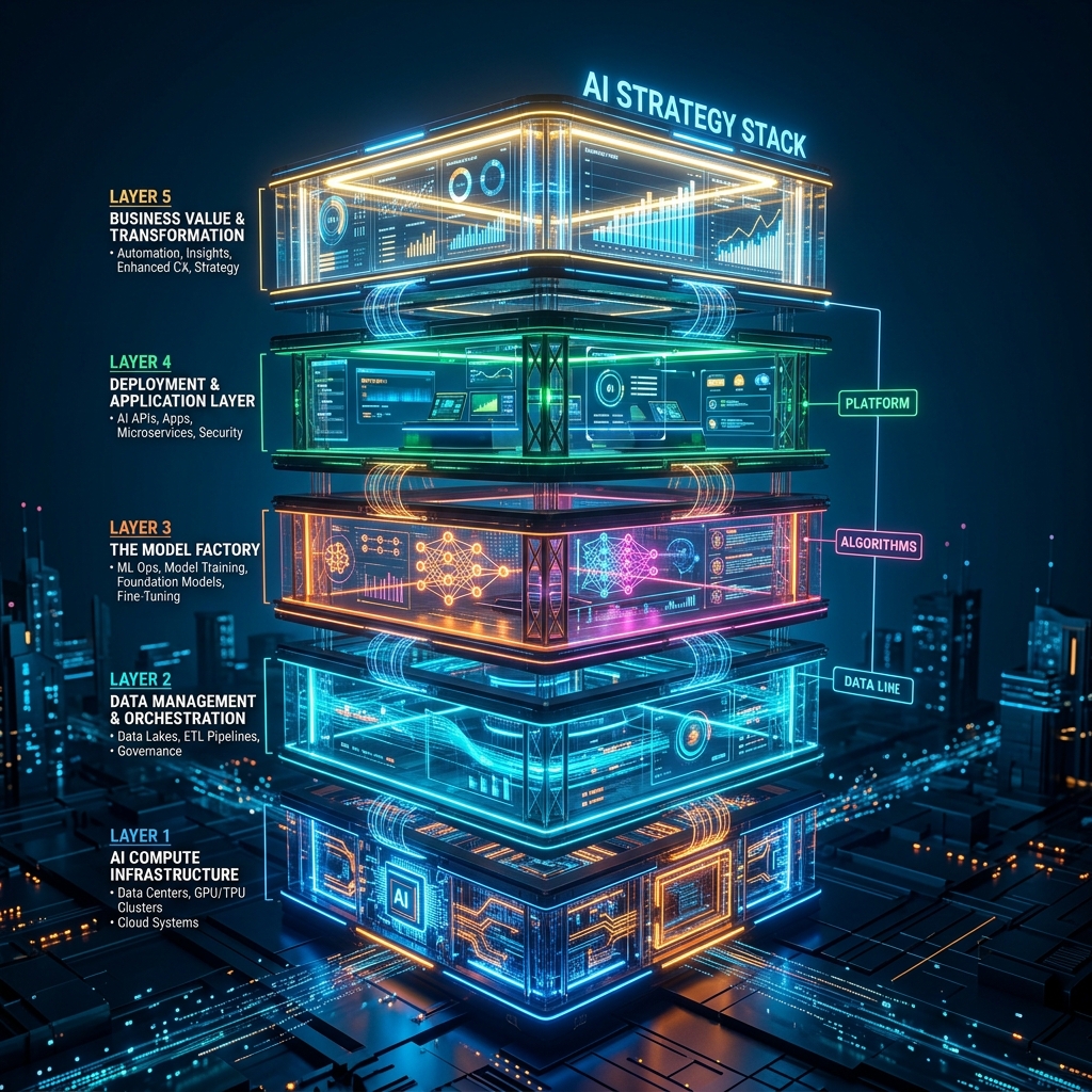 To actually capture value, organizations need to stop buying tools and start building a stack. The AI Strategy Stack is a sequential, proprietary framework consisting of five non-negotiable layers: infrastructure, data discipline, AI capability, decision intelligence, and the operating model.